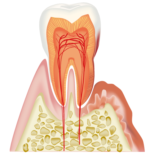 出血や口臭の症状がより深刻化し、歯石が目につく状態です。また、骨が後退していくと歯がぐらつき始めます。歯石を取り除く、歯周外科にて治療を行います。