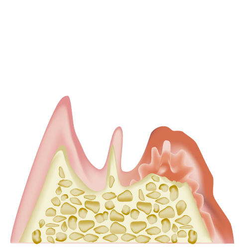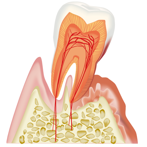 歯肉が真っ赤に腫れた状態です。骨がより後退し、歯が大きくぐらつき始めます。歯周外科にて治療を行い、治療が困難な場合は抜歯を行います。